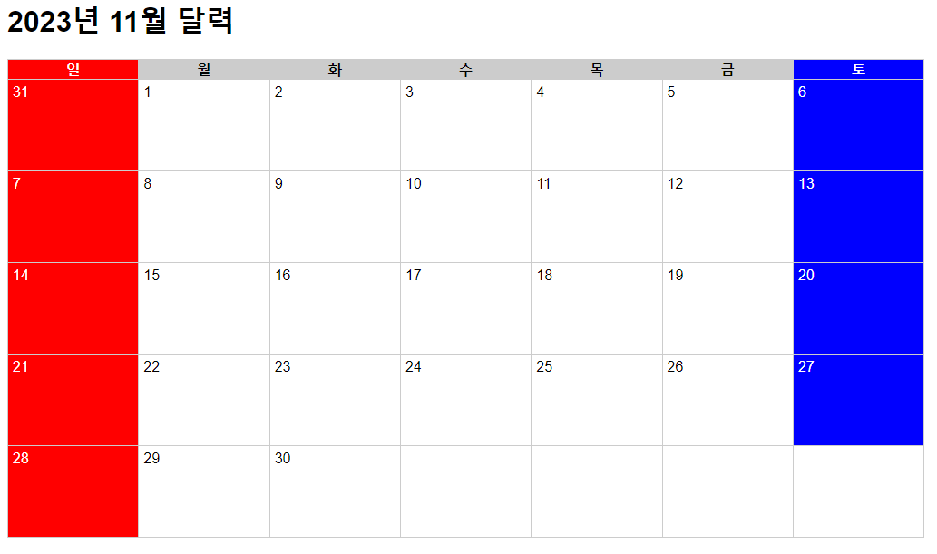 2023년 11월 달력 코드입니다.