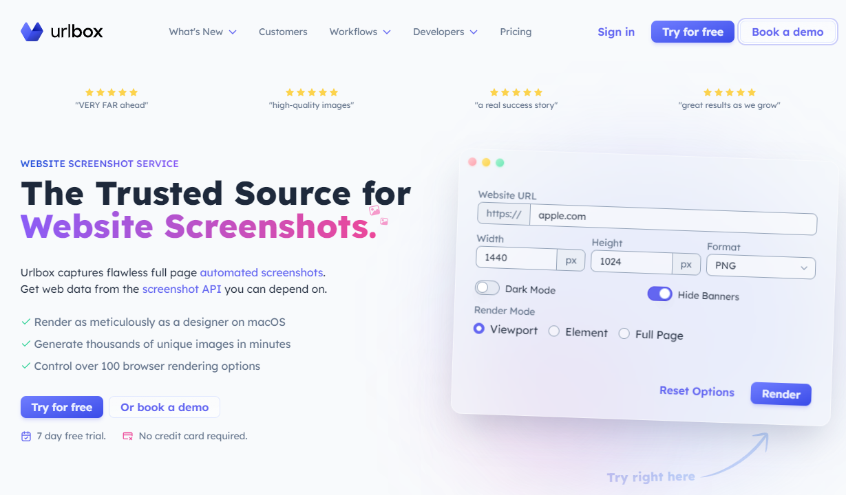 Take accurate screen grabs of web content with Urlbox. Trusted by 650+ customers generating thousands of images per minute. Start your free trial today.